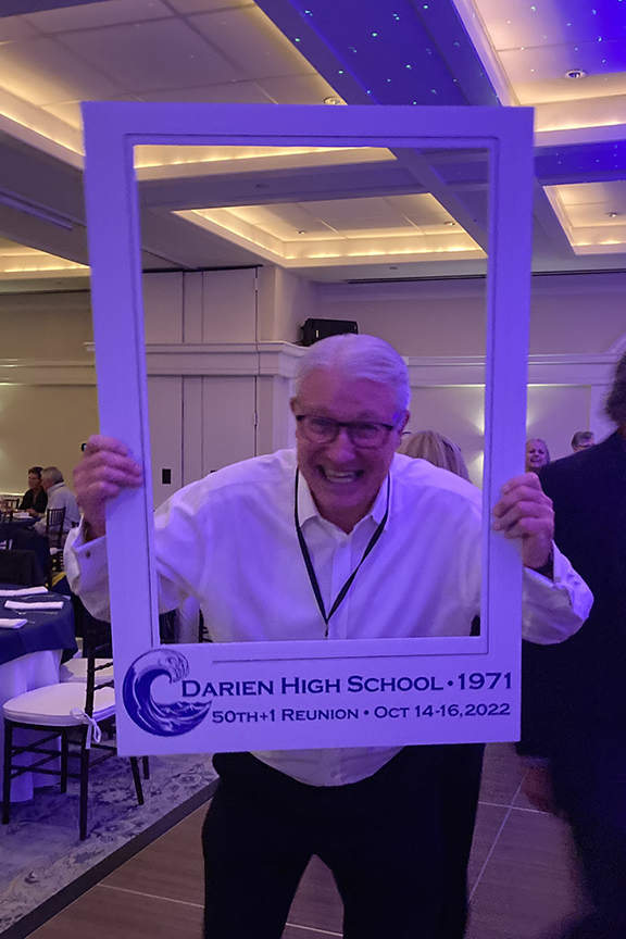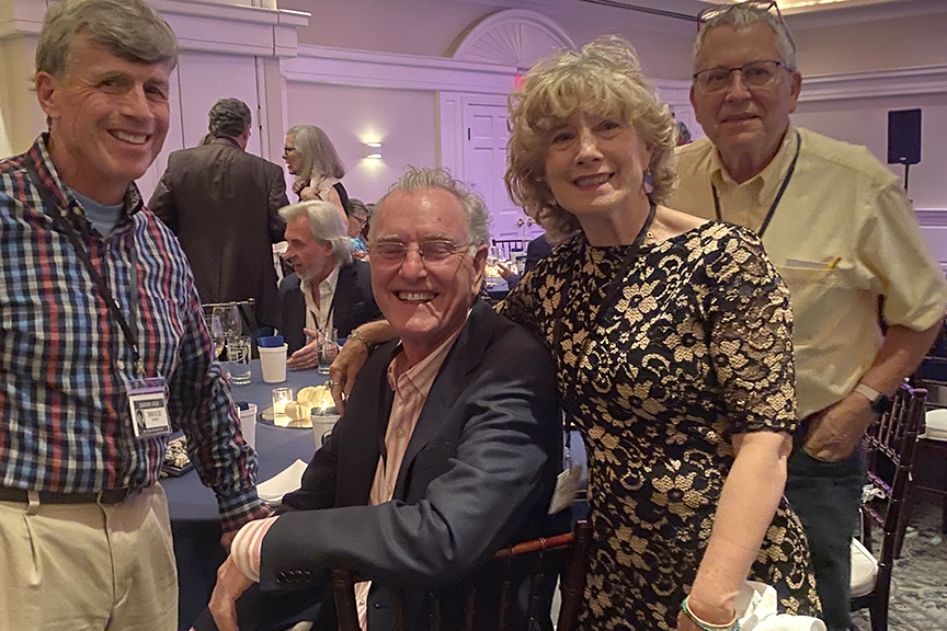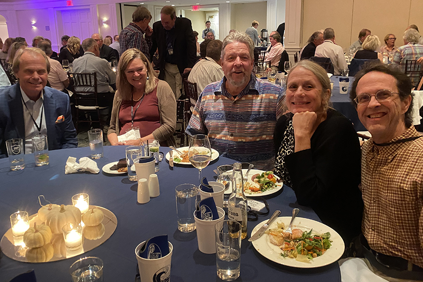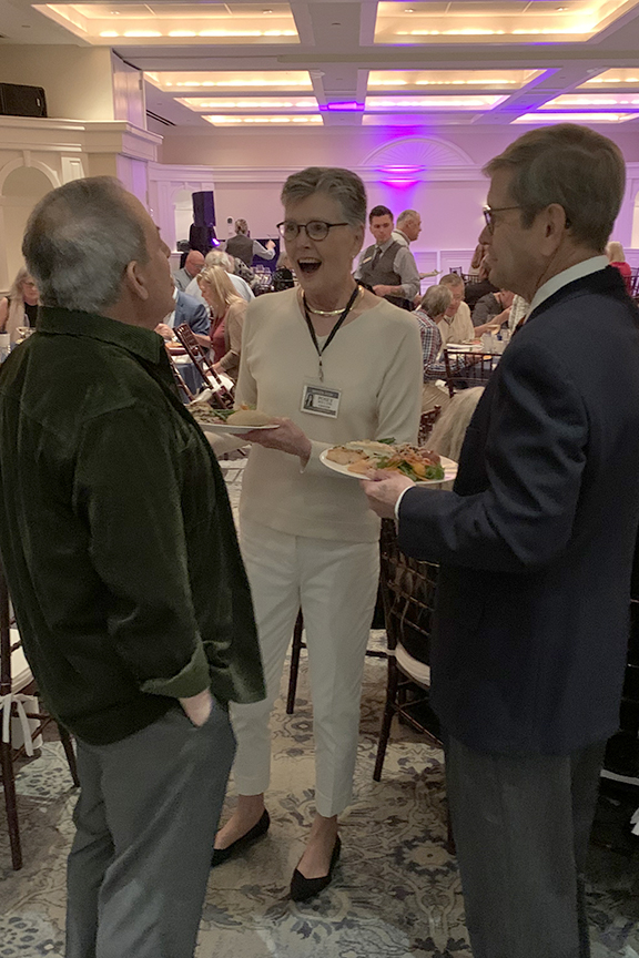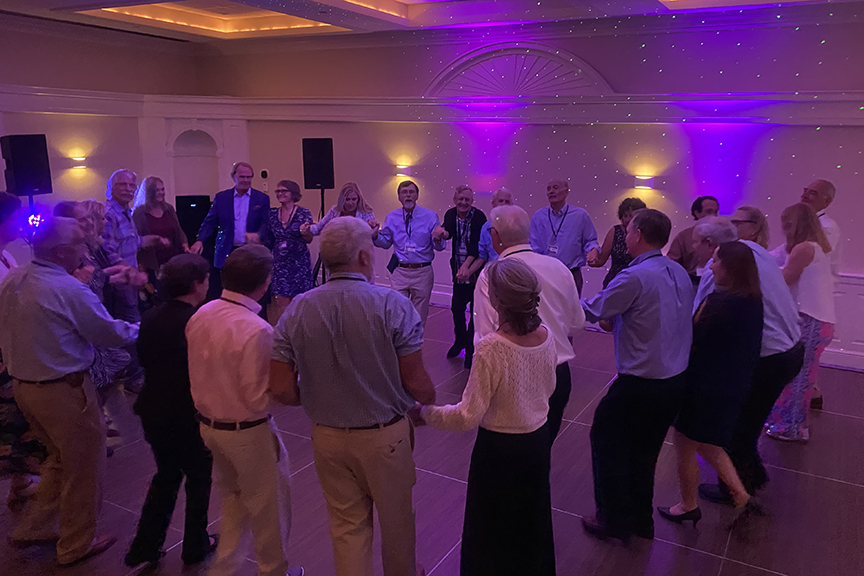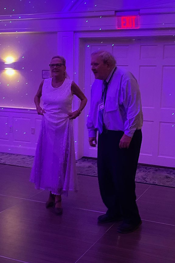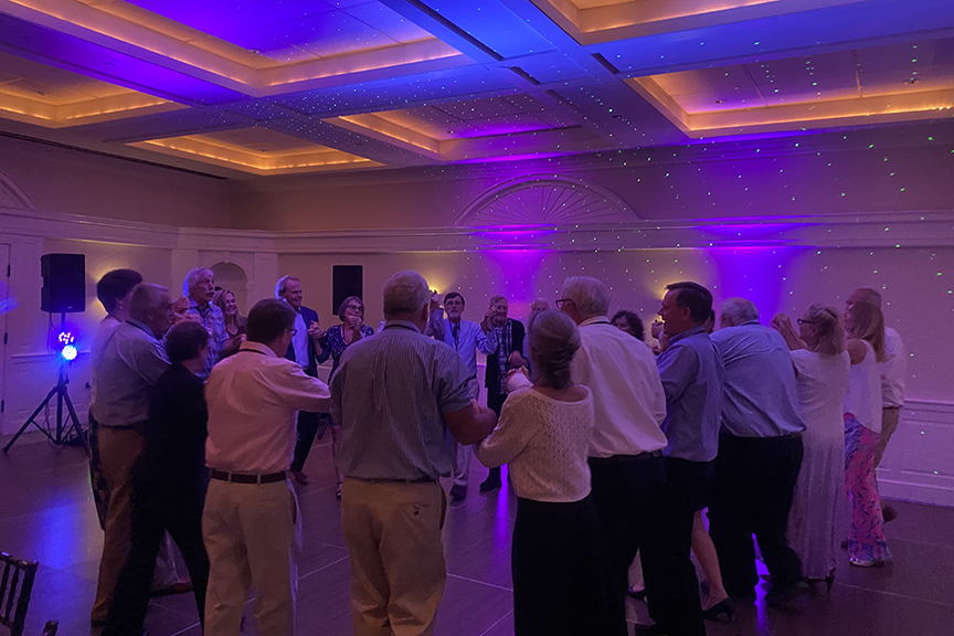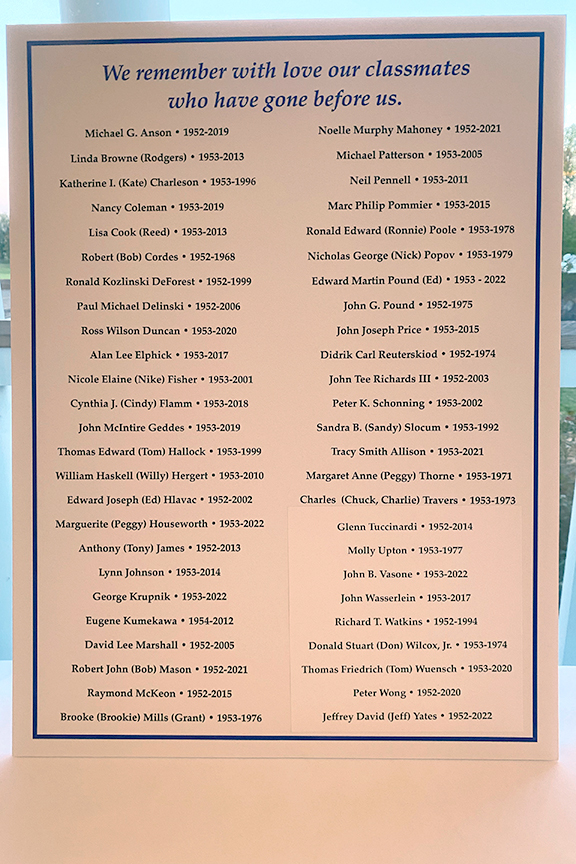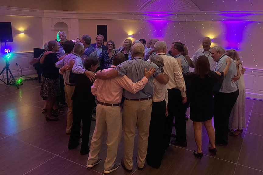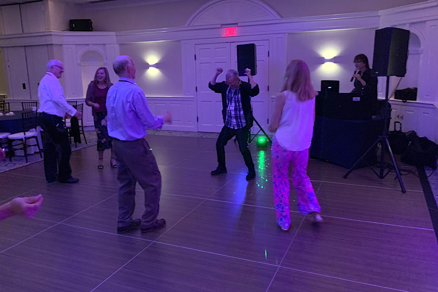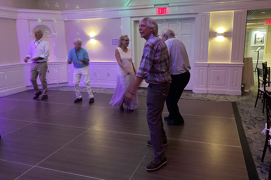 Still fitting into his Temptations jacket from the senior year talent show, Hayes Clark did another great job as emcee, first thanking the hardworking reunion committee (Come on, two years of zoom meetings with Gail keeping people focused…?!), leading a moment of reflection remembering those classmates who have departed, and then humorously reporting on commonalities from the questionnaire responses. (Questionnaires still being accepted until the end of December 2022.)