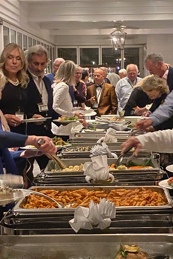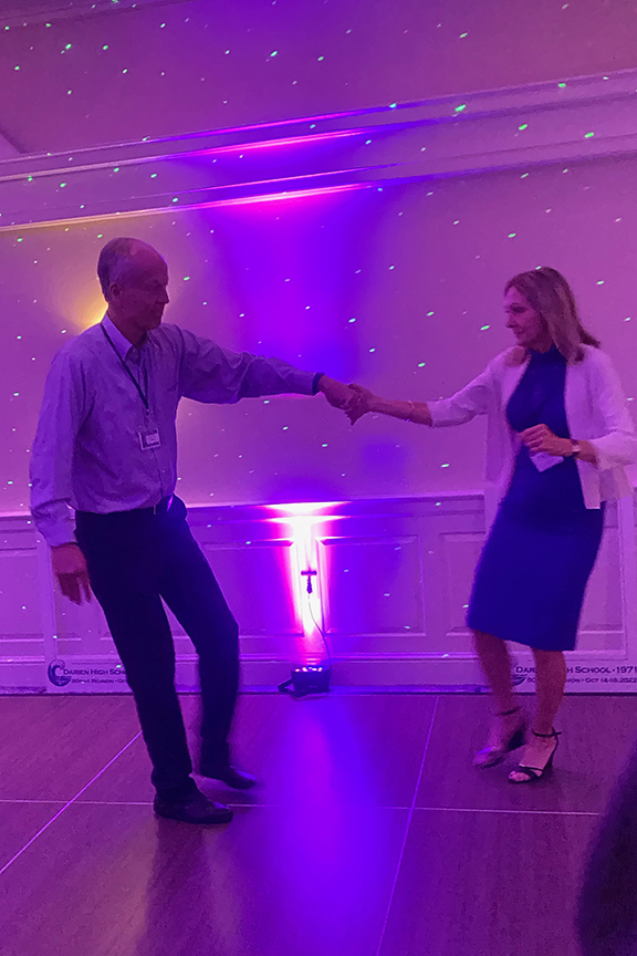 The Country Club of Darien was the perfect venue – a big hallway to mingle in and enjoy drinks and hors d’oeuvres, a delicious buffet and seating at tables that were invitingly close, and a beckoning dance floor with groovy lights and non-stop music from OUR era, provided by DJ Anthony Radice.