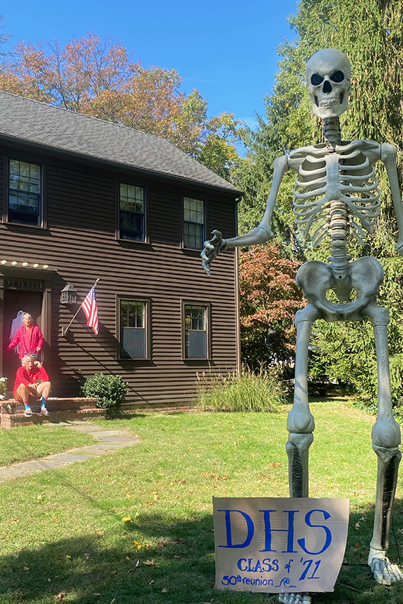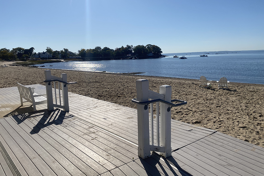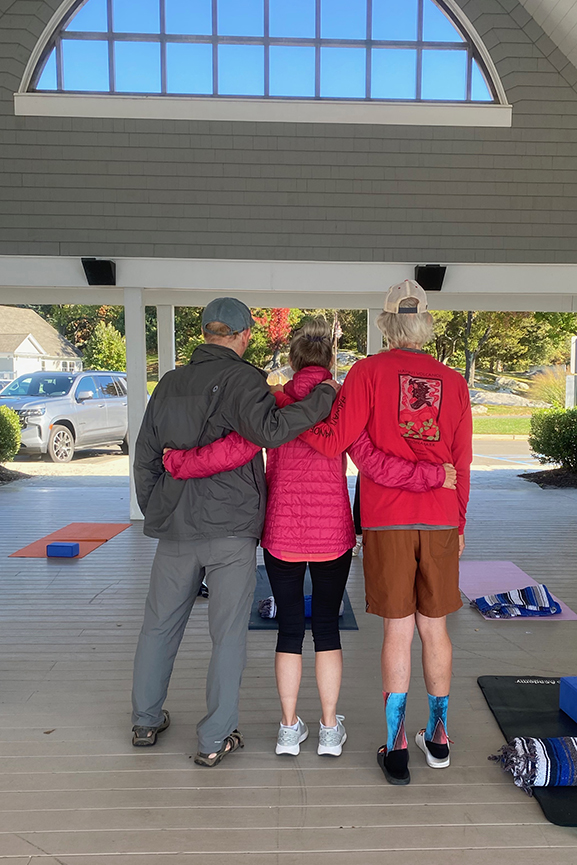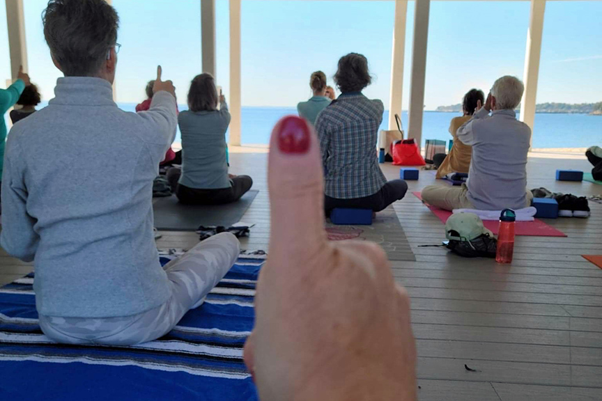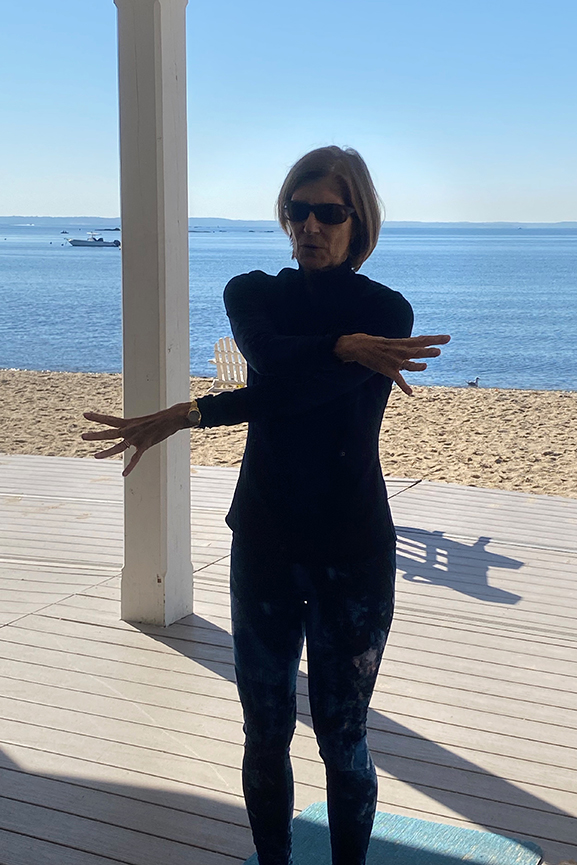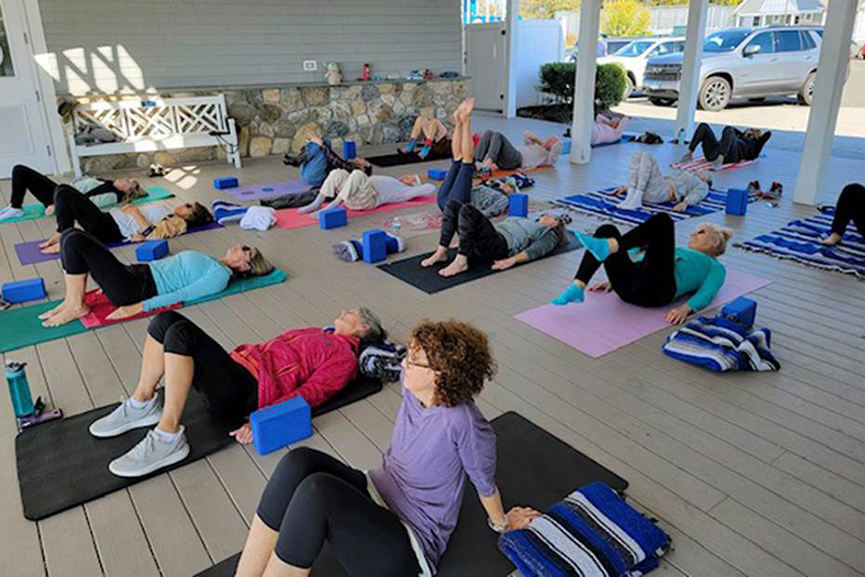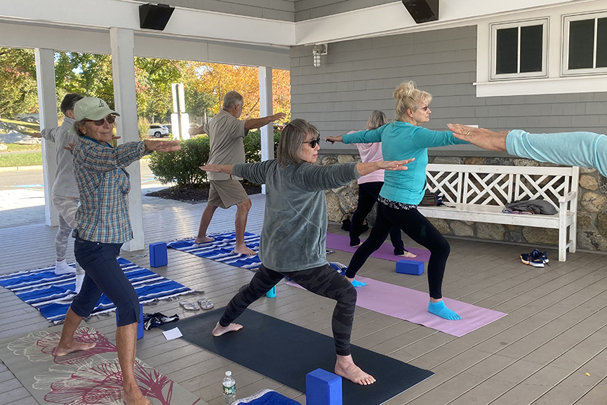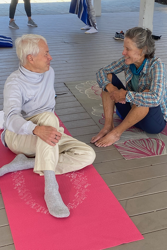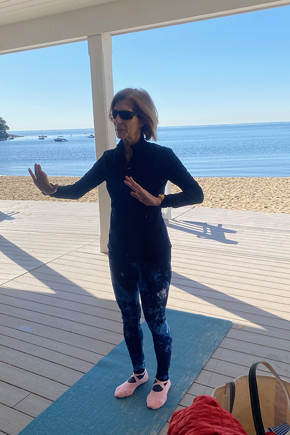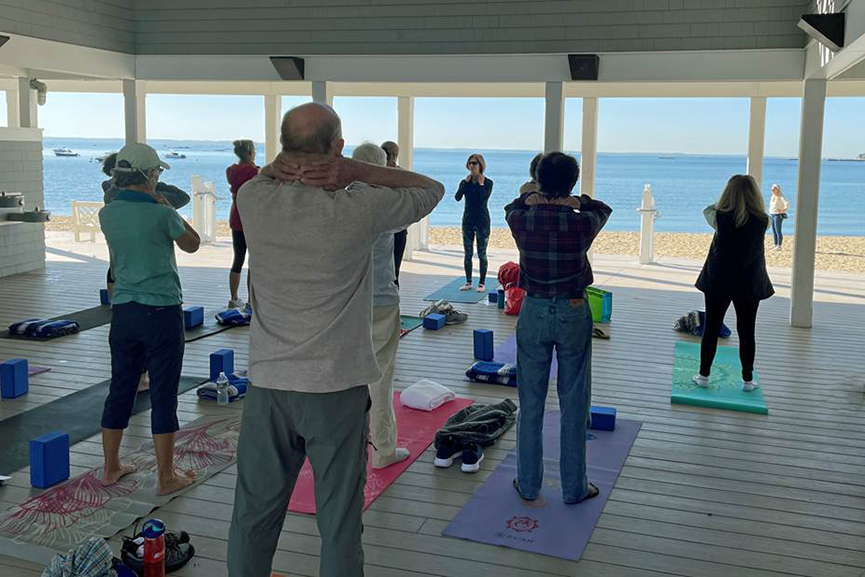Saturday morning at 10:30, a group of 17 classmates and significant others met certified yoga instructor Sue Reichart Allen for a gentle class in the most picturesque of settings at Weed Beach. Yogis came from all over the country, from Colorado to Iowa to Wisconsin to Massachusetts to Connecticut. As we practiced our peaceful session, the sounds of joy and laughter were heard as youngsters ran around the enclave. The class ended with savasana (resting pose) and a sweet message from Sue. After the class, we all headed off to lunches around town and to relax before Saturday night’s dinner dance at the Country Club of Darien.