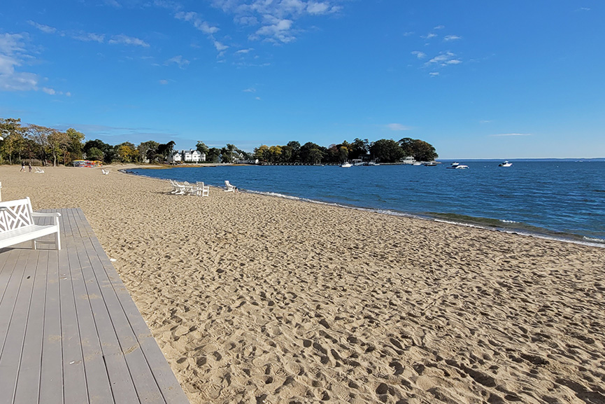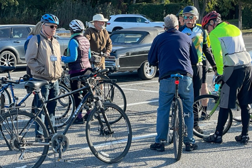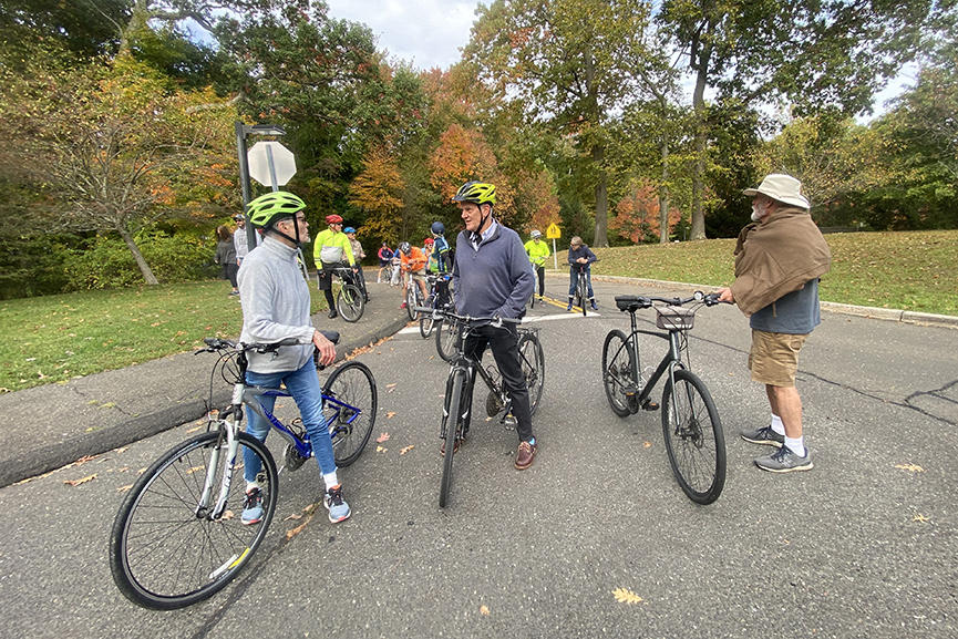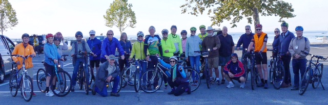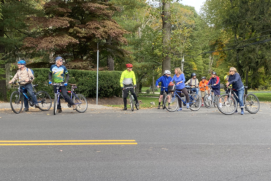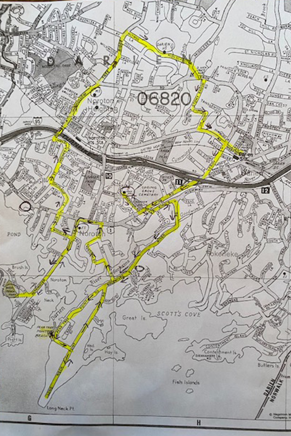 Sunday’s cool, bluebird morning was perfect for the 24 enthusiastic bicyclists who met at Pear Tree Point Beach for a tour of Darien on bicycles brought from home, borrowed, or rented. Bruce Manchon organized the activity and Bill Wright followed in the appropriately-decorated “sag wagon.” The 90-minute ride (route shown on map below) included Long Neck Point’s finest coastal real estate, Darien High School’s unrecognizeable-to-us campus, and many beautiful neighborhood roads.