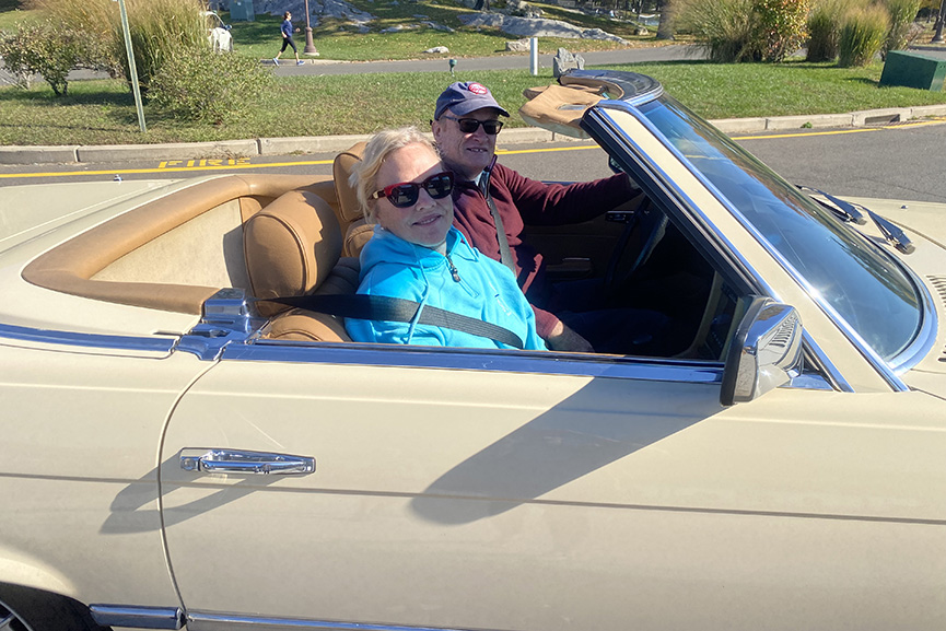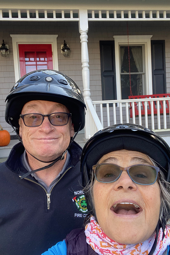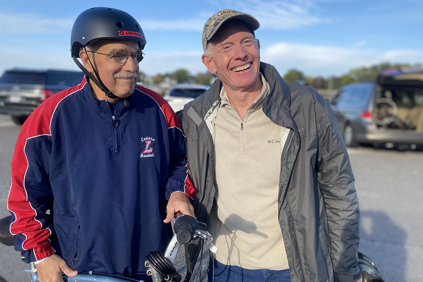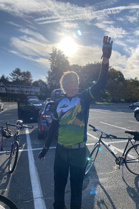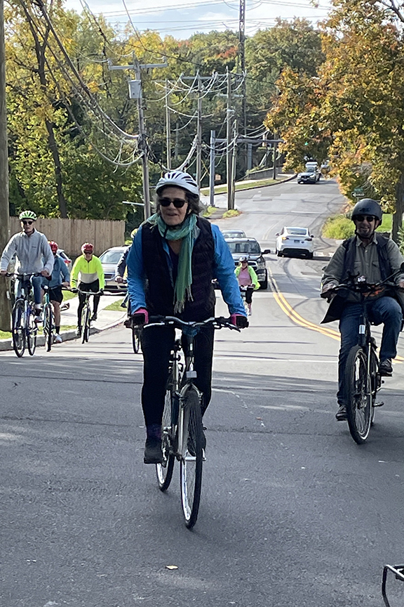 We lost David Hendrickson and Bruce Koehler right out of the gate with a broken bike chain and a dead battery, but the stalwarts enjoyed many smiles and waves from walkers, as well as honking horns (happy honks), thumbs up, and shouted congratulations from passing cars. One of many fun comments was from a woman driving by, who yelled out with a huge smile, “I am not even 50 years old and look at you all riding around town!”