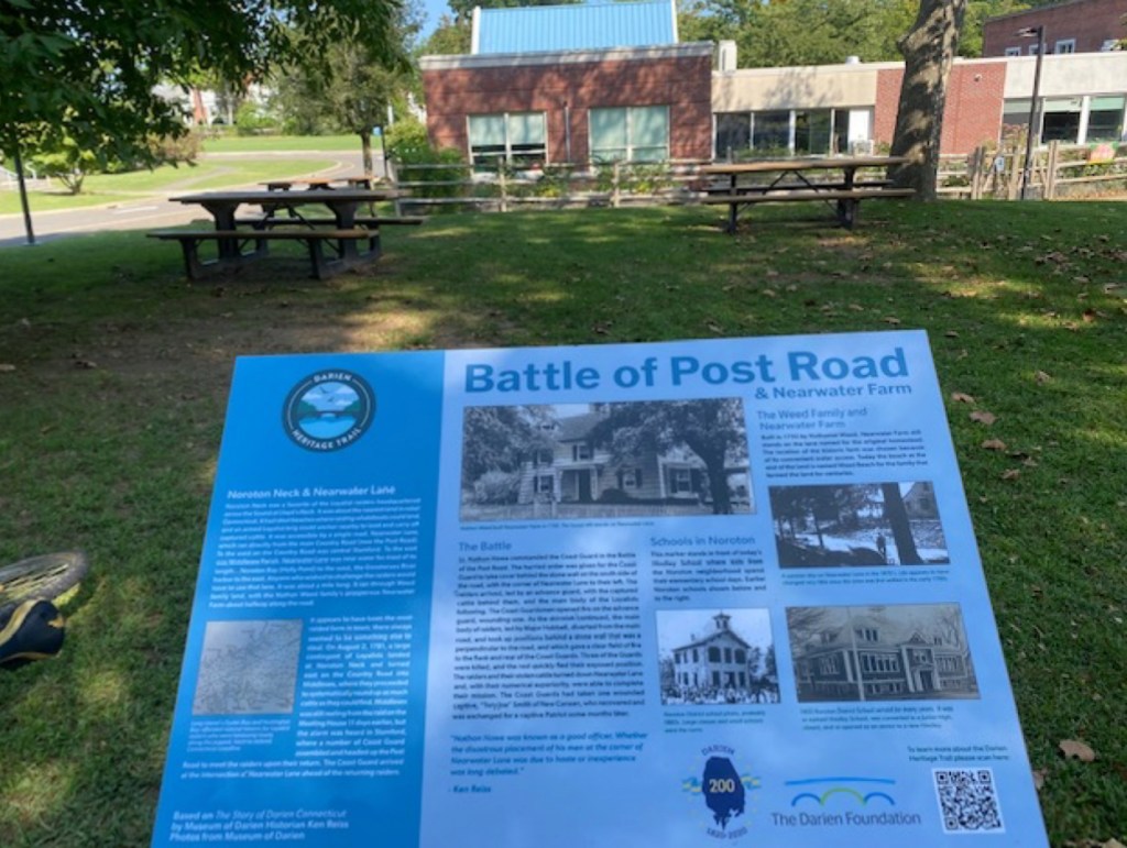 You can follow the Darien Heritage Trail, begun in 2020, which has nine markers around town as of this posting. The bottom photo is on the property of Hindley School, marking a battle that the Tories won that day. Interestingly, Doug Lawrence’s historic house, a short distance away on the Post Road, was burnt to the ground in that battle and rebuilt in 1790. They’ve found musket balls in his front yard!