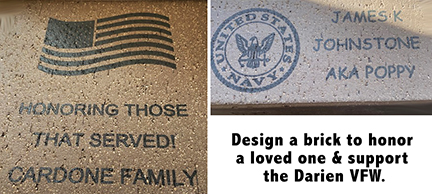 Here’s something you might want to support: A fundraiser by the Darien VFW. Buy a brick that you can design and personalize it in any way to honor a vet or remember your Darien family…Go to: https://www.thatsmybrick.com/darienvfw/design-brick.php