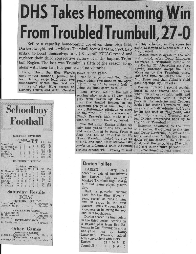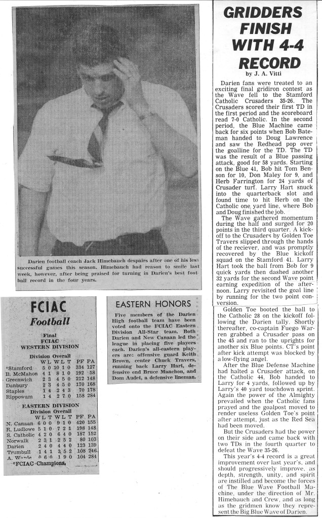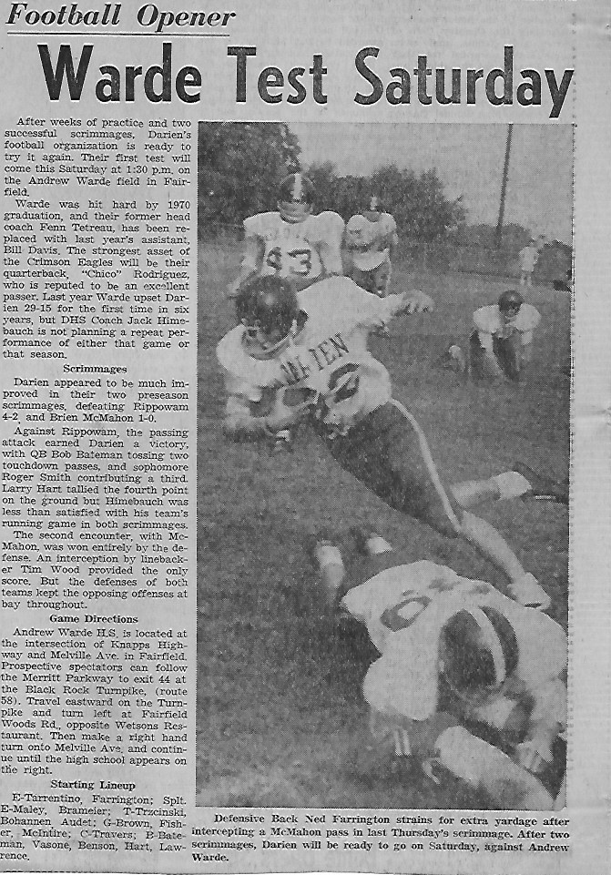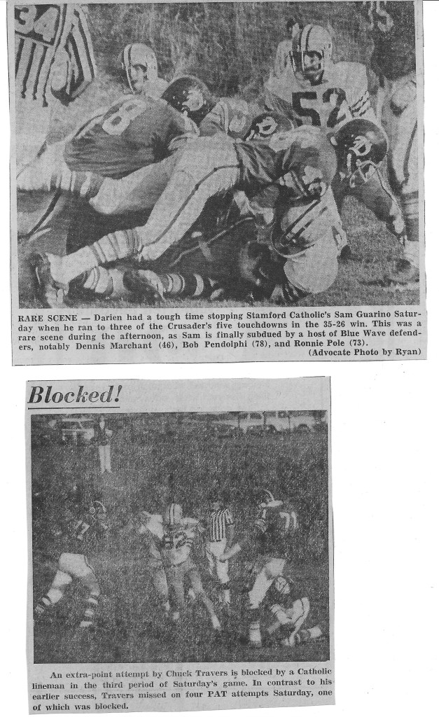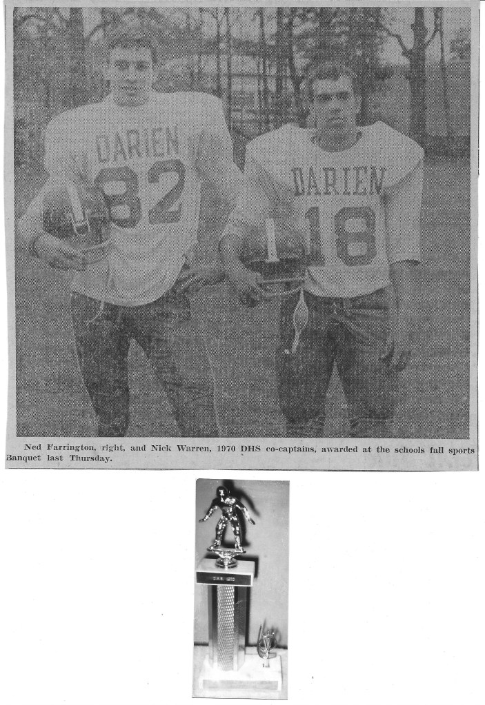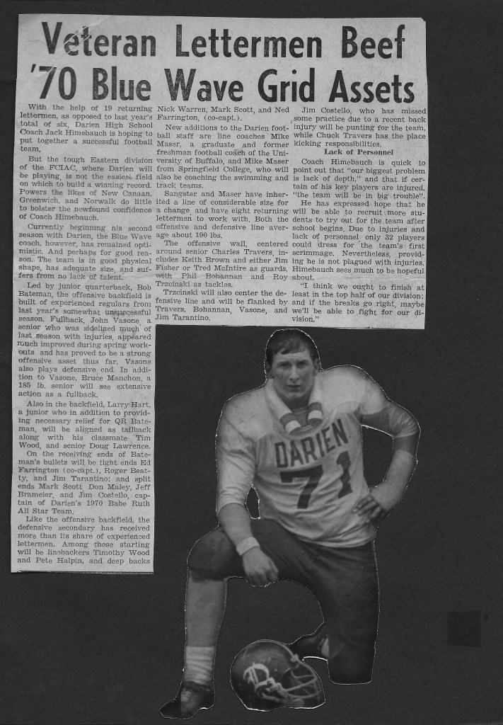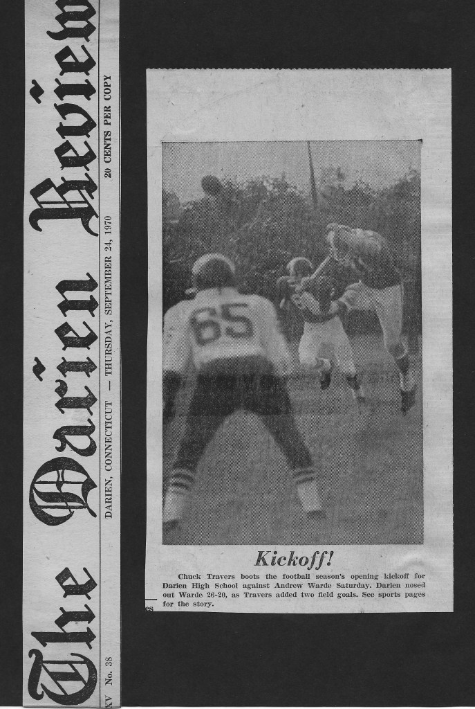 Thank you to Walt Travers, younger brother of Chuck/Charlie Travers, for access to the dozens of photos and Darien Review and Neirad clippings the family kept of Chuck (who was #71!) and the DHS gridiron action. A selection is included below, including some sports columns by Joe Vitti ’71.