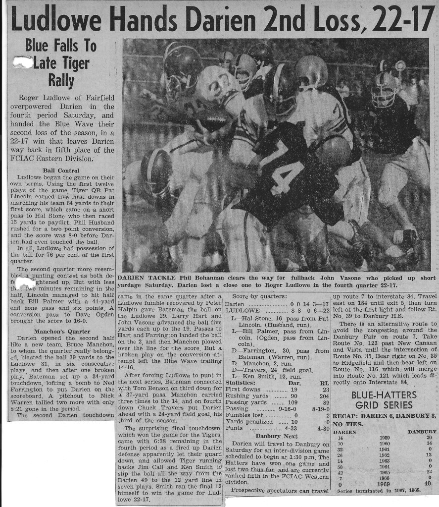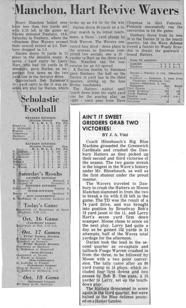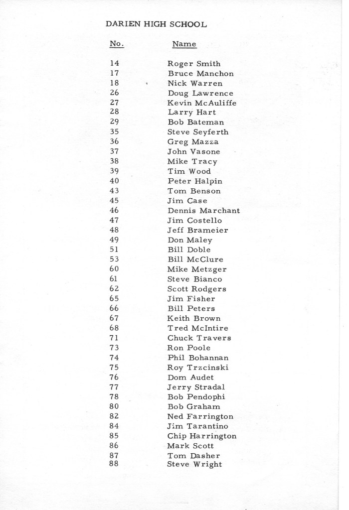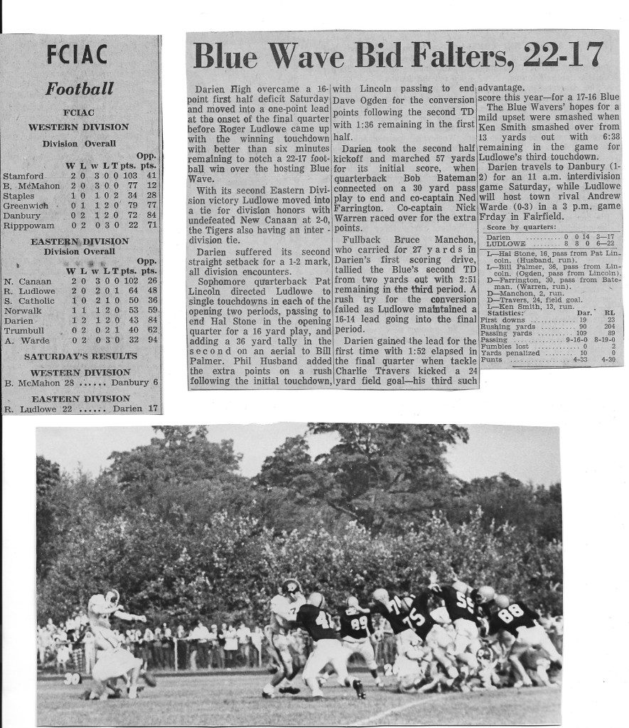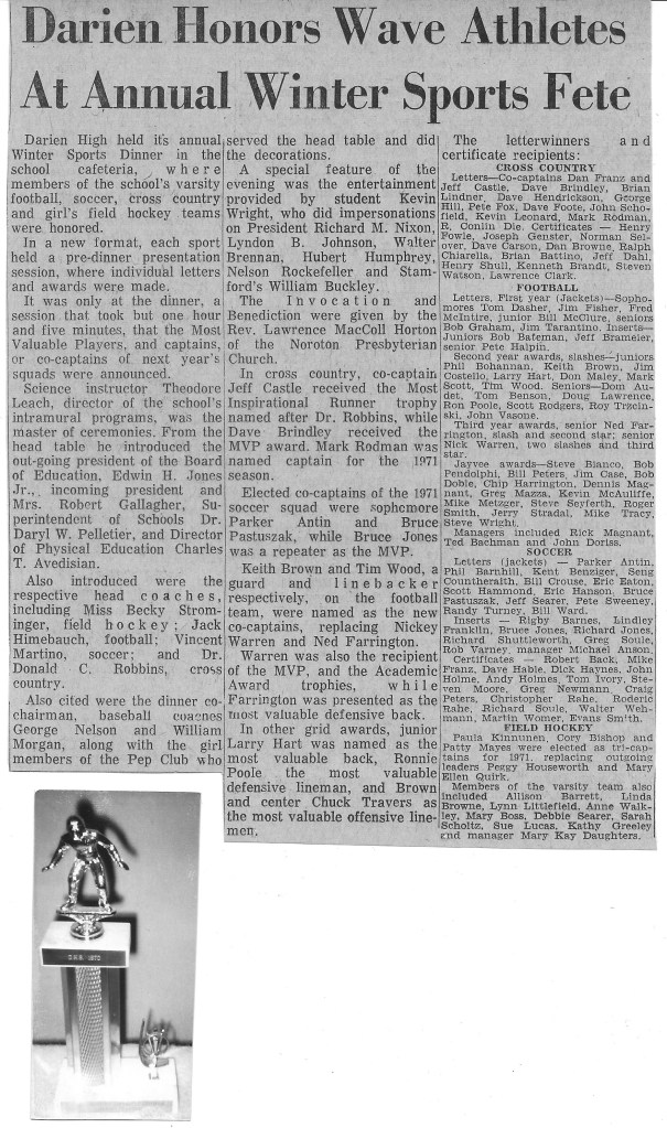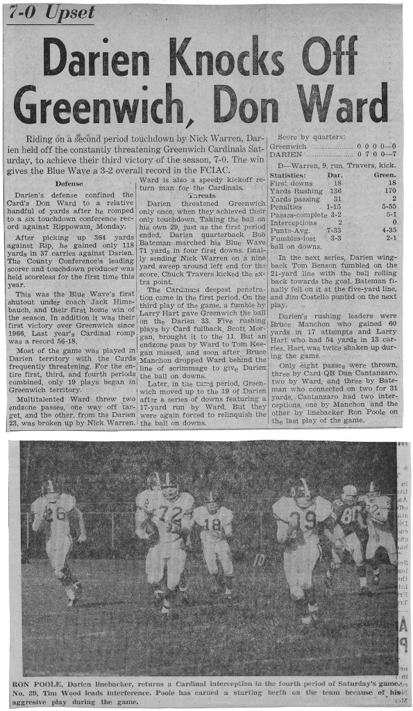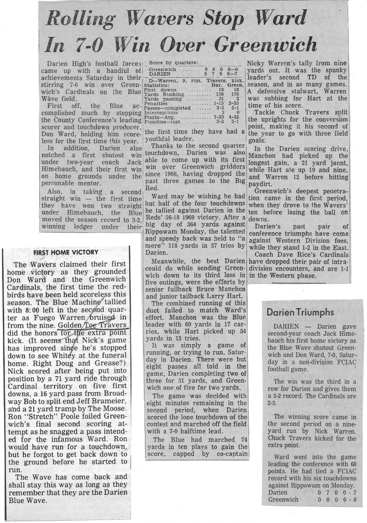 Thank you to Walt Travers, younger brother of Chuck/Charlie Travers, for access to the dozens of photos and Darien Review and Neirad clippings the family kept of Chuck (who was #71!) and the DHS gridiron action. A selection is included below, including some sports columns by Joe Vitti ’71.