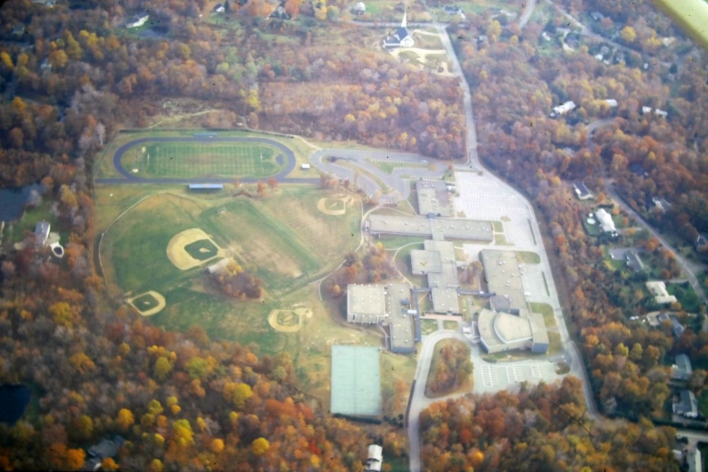 Darien High School, as seen from a plane piloted by Mike Moore in 1970 – yes, he had his pilot’s license in HS!